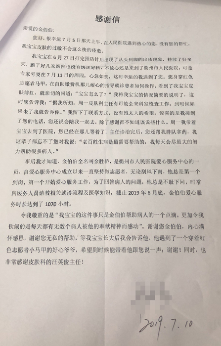 事后我才知道,金伯伯全名叫金勝橋,是衢州市人民醫(yī)院愛心服務(wù)中心的一員,自愛心服務(wù)中心成立以來一直堅持做志愿者,無論刮風(fēng)下雨,他總是第個到崗,第一個開始愛心服務(wù)工作,為了回答病人的問題,他總是不恥下問,時常向醫(yī)務(wù)人員請教相關(guān)就診流程及醫(yī)學(xué)知識,截止2019年6月底,金伯伯愛心服務(wù)時長達(dá)到了1070小時。