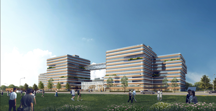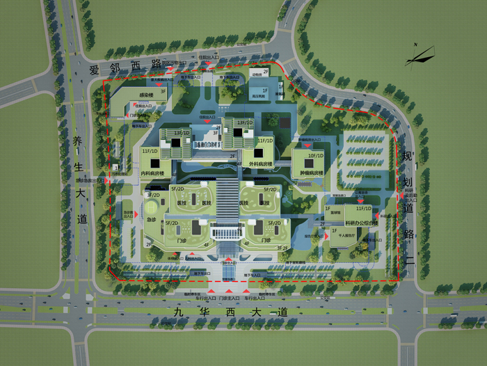 項目總用地面積14公頃(208.75畝),總建筑面積35.78萬平方米,規(guī)劃配置床位2000張,總停車位3206個,由門急診醫(yī)技樓、內(nèi)外科住院大樓、腫瘤病房樓、科研辦公綜合樓、感染樓等組成。