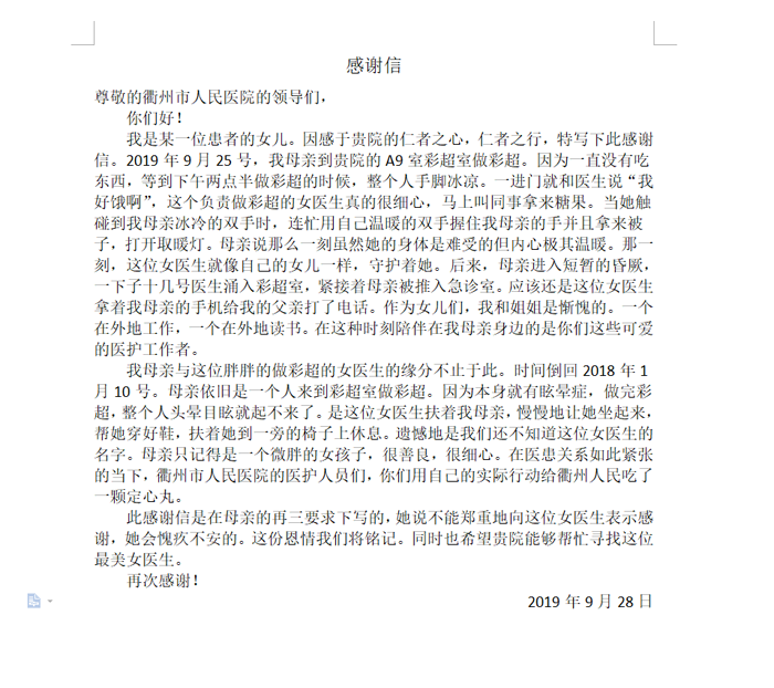 結(jié)合許女士的描述得知,許女士口中的這位微胖的女醫(yī)生是彩超室的薛格醫(yī)生,對于收到這封感謝信,她只是說了一句:“這本來就是我們應(yīng)該做的。”