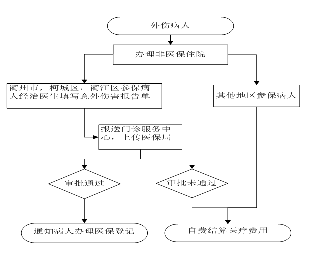 注:衢州市、柯城區(qū)、衢江區(qū)參保病人填寫《意外傷害報(bào)告單》到門診服務(wù)中心辦理。其他地區(qū)參保病人醫(yī)療費(fèi)用自費(fèi)結(jié)清到當(dāng)?shù)蒯t(yī)保局報(bào)銷。