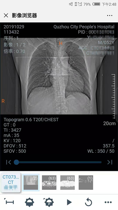 10月30日,住院患者俞先生收到一條短信提醒“【云影像】衢州市人民醫(yī)院提醒您,俞先生的CT報告已完成……”俞先生隨即點擊手機上的瀏覽鏈接,輸入身份證后六位,驗證完成,短短幾秒鐘,躺在病床上也能查看到自己的CT電子報告和影像,俞先生直呼神奇。