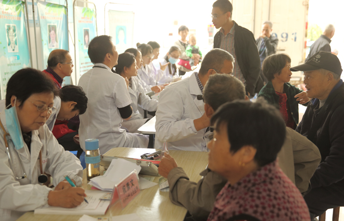 專家們耐心解答、分析報告、測血壓、測血糖,向村民們發(fā)放健康宣教資料,普及健康的生活方式。