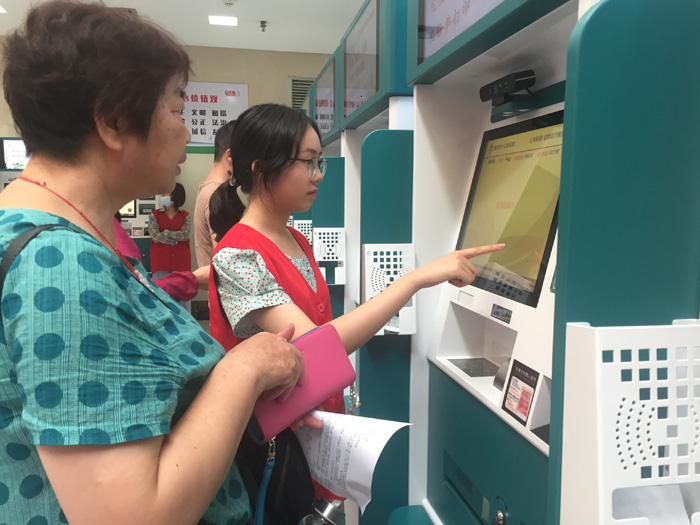 (圖為陳澤瑀指導(dǎo)患者使用自助機(jī)掛號)