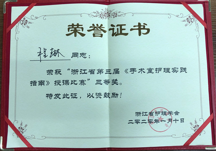 經(jīng)過(guò)選題定位、教案設(shè)計(jì)、授課方式等方面的精心設(shè)計(jì),程琳代表衢州地區(qū)與浙江大學(xué)醫(yī)學(xué)院附屬第一醫(yī)院、浙江大學(xué)醫(yī)學(xué)院附屬第二醫(yī)院、浙江大學(xué)醫(yī)學(xué)院附屬邵逸夫醫(yī)院等省內(nèi)眾多醫(yī)院的優(yōu)秀選手同臺(tái)競(jìng)技。經(jīng)過(guò)激烈緊張的角逐,程琳以穩(wěn)健的臺(tái)風(fēng)、別出心裁的教案設(shè)計(jì)得到了評(píng)委老師的肯定,榮獲浙江省第三屆《手術(shù)室護(hù)理實(shí)踐指南》授課大賽三等獎(jiǎng),是歷年來(lái)最好成績(jī)。