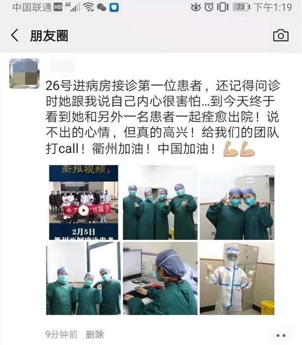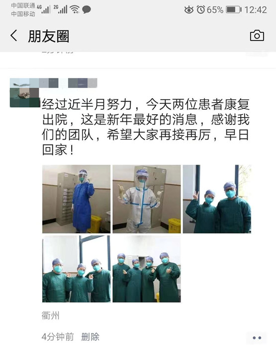 衢江區(qū)的胡女士是第一例轉入我院救治的重型確診病例。1月23日,胡女士從武漢返回衢江,因頭痛、咽喉疼痛到當?shù)匦l(wèi)生院就診, 1月25日,經(jīng)市級醫(yī)療專家組會診,確定為新型冠狀病毒感染的肺炎重型病例,1月26日,轉入我院。經(jīng)過11天的隔離治療后出院。