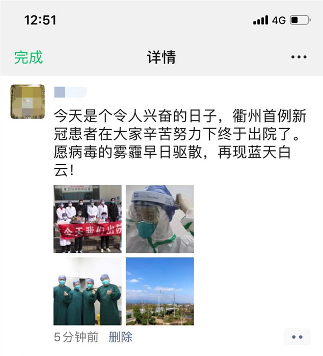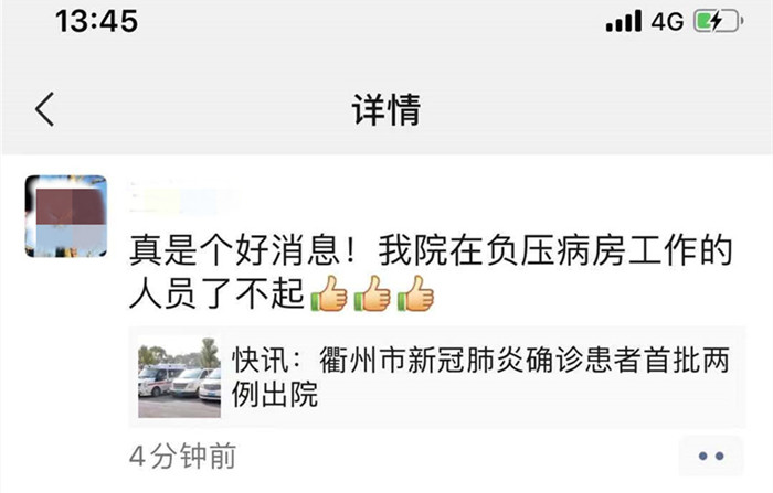 “我很感動,感謝衢州市人民醫(yī)院的醫(yī)生、護士。住院治療期間,最辛苦的是幫助我們的每一個醫(yī)護人員,醫(yī)生護士不離不棄,一直守護在身邊,我能這么快出院,離不開他們精心的護理和治療。”胡女士表示,住院期間得到了醫(yī)護人員的精心照顧,出院后還會留在家中繼續(xù)做好自我隔離,密切留意身體狀況。