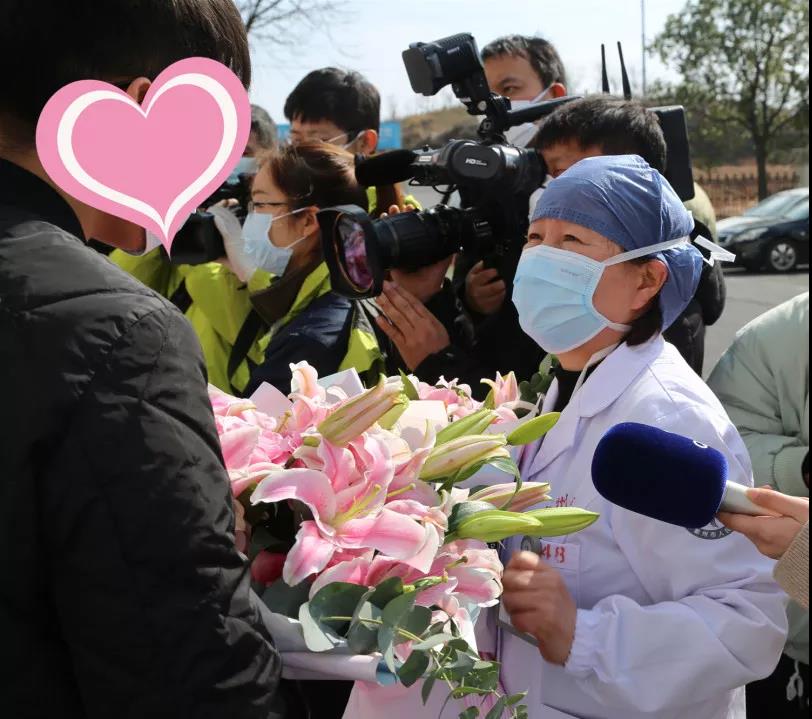 衢州首批新型冠狀病毒出院患者為彭春仙送上鮮花