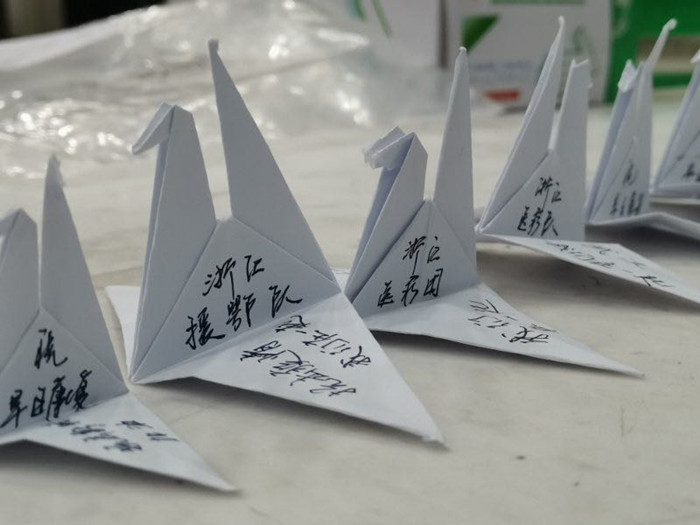 她和同組的其他5位小伙伴每人折一只,分別在紙鶴的翅膀上寫上祝福語,“抗擊疫情,我們在一起!”“武漢,我們在一起!”“浙江醫(yī)療隊,祝早日康復(fù)”,一句句暖心的話語在指尖流淌。