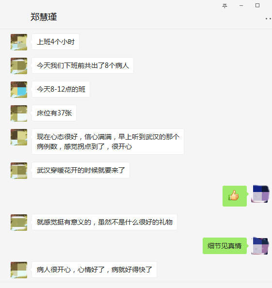 “現(xiàn)在心態(tài)很好,信心滿滿,今天有8個病人出院,早上聽到武漢的新增病例數(shù),感覺拐點到了,很開心,武漢春暖花開的時候就要來了!”鄭慧瑾說,一只小小的紙鶴,雖然不是什么很好的禮物,但是感覺挺有意義,病人很開心,心情好了,病就好得快了。
