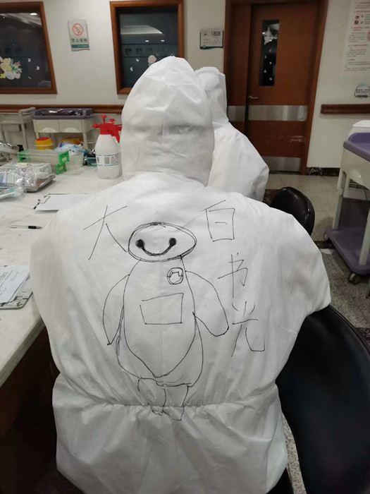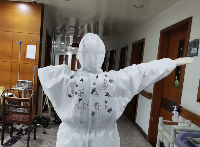 2月21日,結(jié)束了一天的護(hù)理工作后,她又在防護(hù)服背后畫(huà)畫(huà)報(bào)平安,“我愛(ài)星爸爸”“晚安,祝你好夢(mèng)”“大白書(shū)光”……一句句詼諧的話(huà)語(yǔ)看似調(diào)侃實(shí)則溫情滿(mǎn)滿(mǎn),你能猜出哪一個(gè)才是調(diào)皮的她嗎?