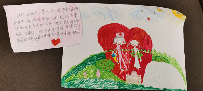 今天是周仙霞女兒的生日,因?yàn)轳v守隔離病房,她不能陪在孩子身邊,連日來,孩子只能把對媽媽的思念畫成一幅幅圖畫,稚嫩的筆觸流露出深深的掛念。