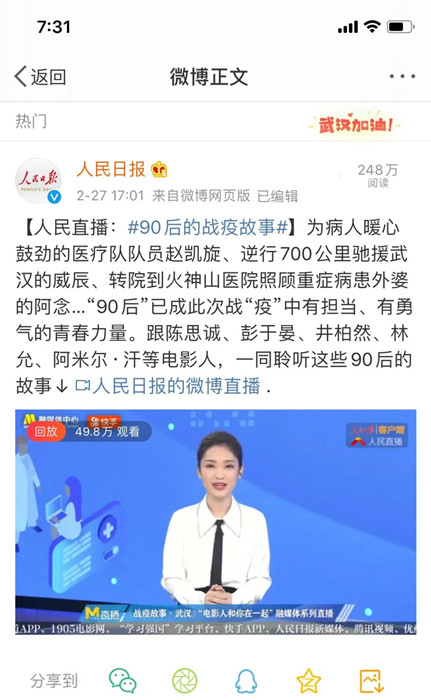文章來源:人民日報(bào)微博、中國電影報(bào)道微博 宣傳統(tǒng) 作者:徐莉 點(diǎn)擊數(shù):5822 更新時(shí)間:2020-02-27