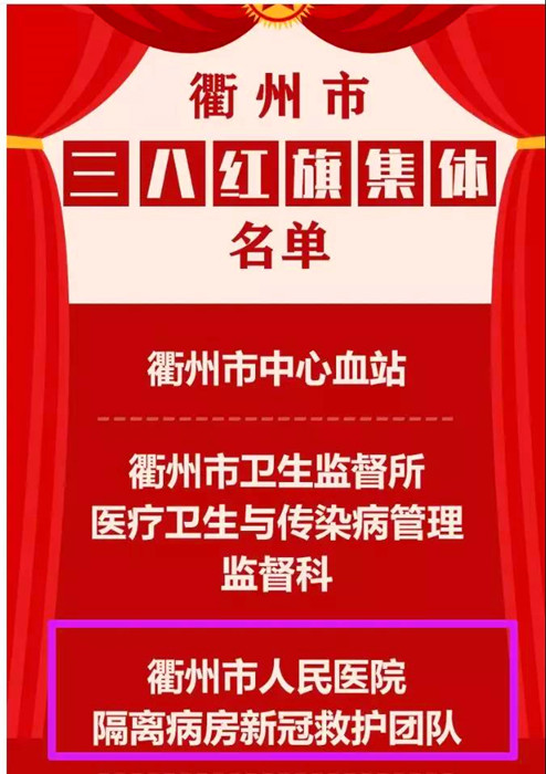 3月7日,市婦聯(lián)公布了2020年度三八紅旗手(集體)、50戶(hù)最美家庭等名單。我院隔離病房新冠救護(hù)團(tuán)隊(duì)榮獲三八紅旗集體,鄭慧瑾、趙凱旋、余娜、王莉娟、王鈺、徐慧、彭春仙、鄭彩霞榮獲三八紅旗手。楊慶和方文浩家庭榮獲最美家庭。