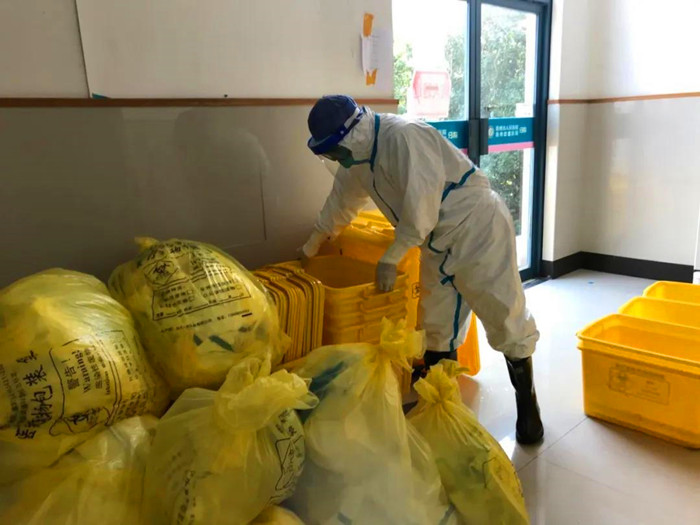 李師傅進(jìn)入隔離病房后,先完成醫(yī)護(hù)人員區(qū)域的衛(wèi)生保潔,整理垃圾、配置消毒液、清掃地面;而后穿戴好防護(hù)用品,進(jìn)入隔離病房開(kāi)始用物清潔、患者床單消毒……每天凌晨5點(diǎn),就能看到李師傅忙碌的身影。