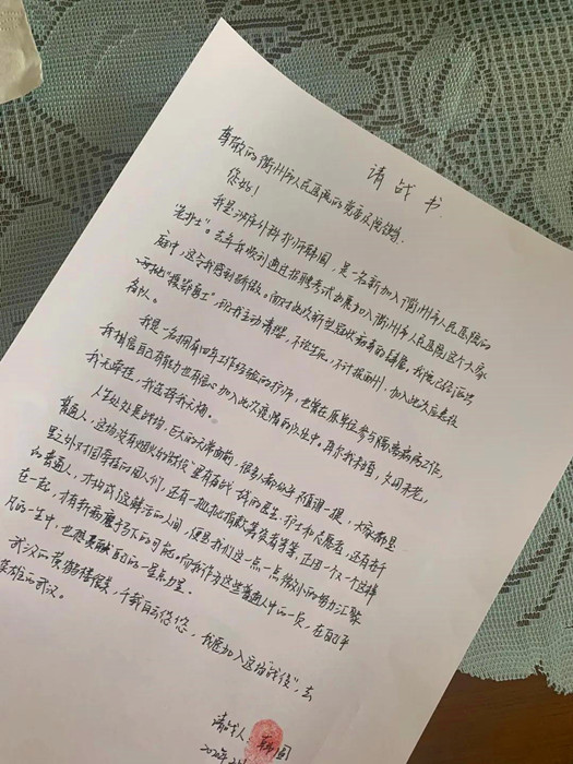 疫情形勢(shì)嚴(yán)峻,2月9日,衢醫(yī)第二支援鄂醫(yī)療隊(duì)赴漢,醫(yī)院再次發(fā)出馳援疫情火線的號(hào)召,組建援鄂人員預(yù)備隊(duì),這一次,韓圓寫(xiě)下了請(qǐng)戰(zhàn)書(shū)?!拔抑鲃?dòng)請(qǐng)纓,不論生死,不計(jì)報(bào)酬,加入此次應(yīng)急支援預(yù)備隊(duì),去守護(hù)英雄的武漢!”在這份豪情滿滿的請(qǐng)戰(zhàn)書(shū)上,這個(gè)勇敢的姑娘摁下了紅指印。