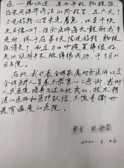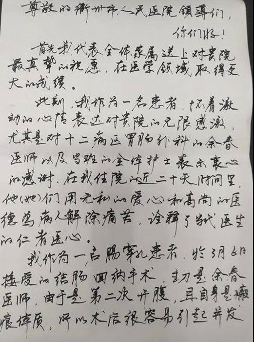3月21日,周先生迎來了出院的日子,住院近二十日,余醫(yī)生和胃腸外科全體醫(yī)護對他的關心和照顧,讓他感激不盡。日前,他親手寫下這封感謝信,表達對醫(yī)護們由衷的謝意,他說,是37度最有溫度的醫(yī)院帶給他治愈的信心和溫暖。
