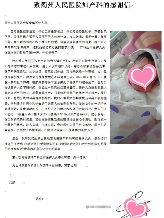 你們用赤誠的心和無私的愛,迎接眾多新生命的誕生,給千家萬戶帶來歡樂與笑聲。這就是我們最可愛的白衣天使——產(chǎn)料全體醫(yī)護(hù)人員,謹(jǐn)此向您們致敬了!道一聲,你們辛苦了!”日前,我院產(chǎn)科住院部收到一封誠意滿滿的感謝信。