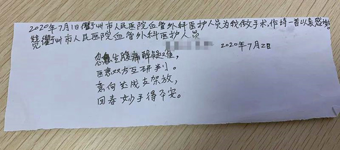 從進(jìn)入手術(shù)室到手術(shù)結(jié)束,整個(gè)微創(chuàng)手術(shù)僅僅持續(xù)了1個(gè)小時(shí)左右,“太不可思議了!除了手術(shù)剛開(kāi)始打麻醉有點(diǎn)痛,沒(méi)有其他不舒服,不知不覺(jué)就結(jié)束了手術(shù),身上也沒(méi)有明顯刀口,只有一個(gè)針眼?!毙g(shù)后第一天,江大爺感覺(jué)甚好,對(duì)血管外科陸煒團(tuán)隊(duì)精湛的技術(shù)水平和優(yōu)質(zhì)護(hù)理服務(wù)十分認(rèn)可。日前,特意賦詩(shī)一首表達(dá)對(duì)血管外科醫(yī)護(hù)人員的感激之情。
