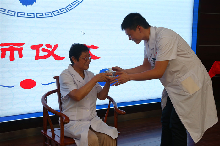 新一批中醫(yī)科年輕醫(yī)生向恩師行拜師禮、作揖禮、敬茶,送上鮮花