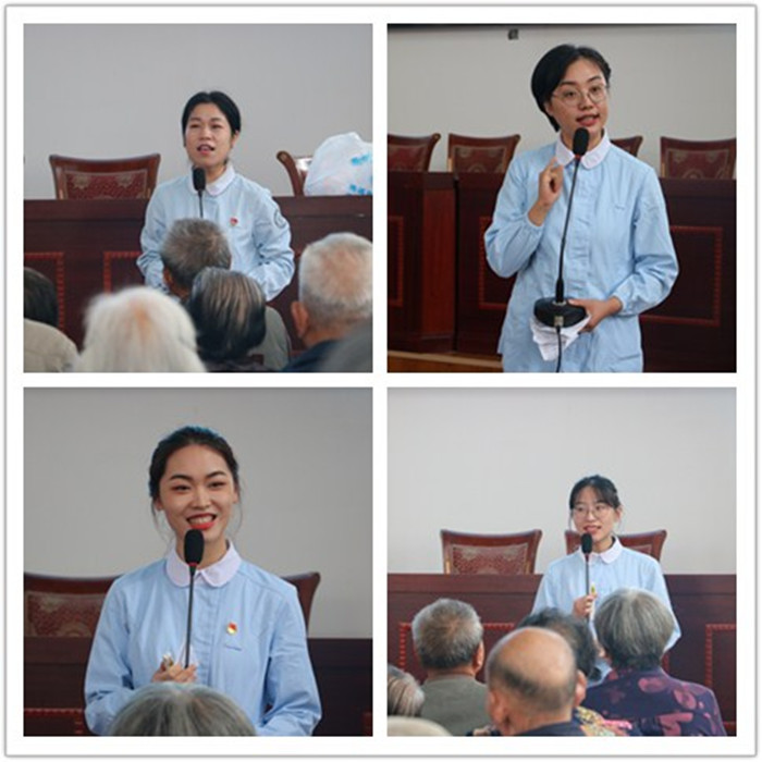 臺上宣講,臺下送溫暖。四位宣講員用起“老本行”和來自醫(yī)院內(nèi)科、外科黨支部的六名醫(yī)療專家醫(yī)療骨干組成60708090健康小分隊”給村民送健康,答疑解惑,測量血壓,發(fā)放宣傳資料,科普健康的生活習(xí)慣,這群愛的天使棒棒噠!