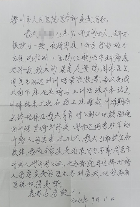 90多歲的患者徐大爺因不慎跌傷臥床一年多,目前在浙江醫(yī)院進(jìn)行康復(fù)治療。恰巧的是,我院中醫(yī)康復(fù)病房的周偉醫(yī)生在浙江醫(yī)院進(jìn)修,為了讓徐大爺?shù)闹w功能鍛煉達(dá)到最佳效果,周偉不僅親自將徐大爺從床上抱上抱下,還耐心傾聽需求,訓(xùn)練期間更是貼心陪護(hù),鼓勵徐大爺堅持,這一切,徐大爺?shù)募覍倏丛谘劾?,記在心里,“老爺子從扶坐到扶站,這里面少不了周醫(yī)生的功勞,我們真誠地感謝他?!?