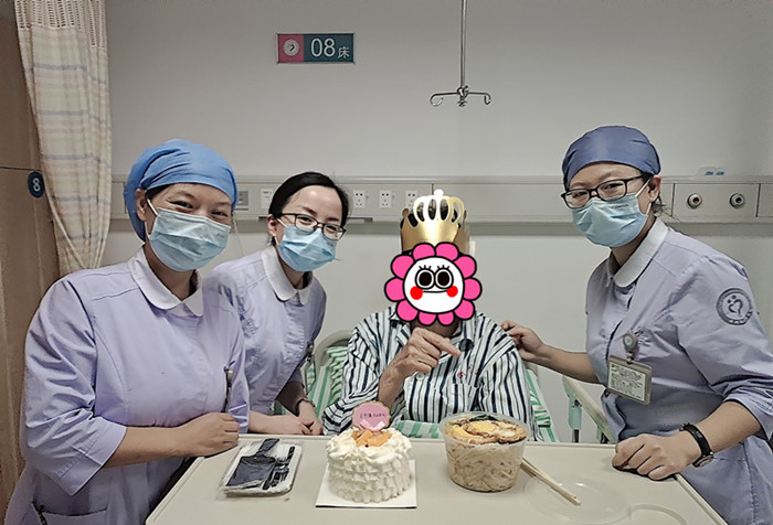 “疫情期間,醫(yī)院暫停探視,那天看到占奶奶的電子信息界面閃爍著生日提示,科室姑娘們想著讓老人家開心開心,決定為老太太過生日?!弊o(hù)士長張新媚說道。