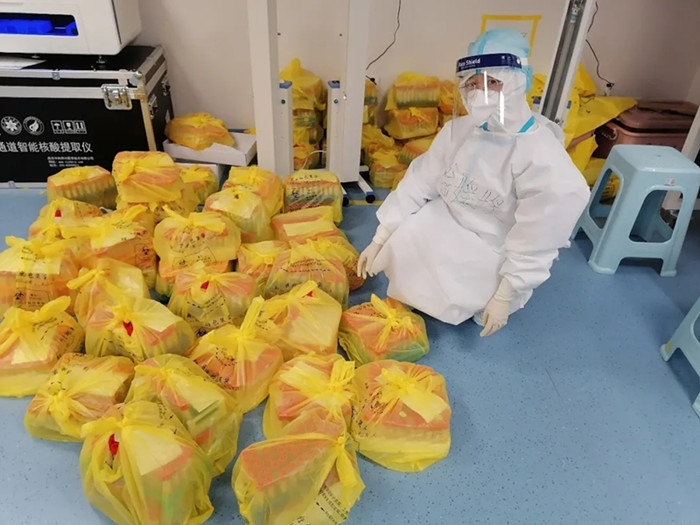 出了實(shí)驗(yàn)室,脫下防護(hù)服,大家的防護(hù)服內(nèi)的衣服全都濕透了,有人手背因?yàn)殚L(zhǎng)時(shí)間戴手套起了密密麻麻的紅疹子,有人因?yàn)檫B續(xù)夜間作業(yè)累得直接躺在休息間的凳子上睡著了,有人趕緊撕開(kāi)面包狂吃……翁媛媛想到這一幕幕,內(nèi)心泛起一絲絲漣漪,“團(tuán)結(jié)一心、迅速高效,順利完成了檢測(cè)任務(wù),我很驕傲,也很感動(dòng),原來(lái)沒(méi)有什么是不可能的!”