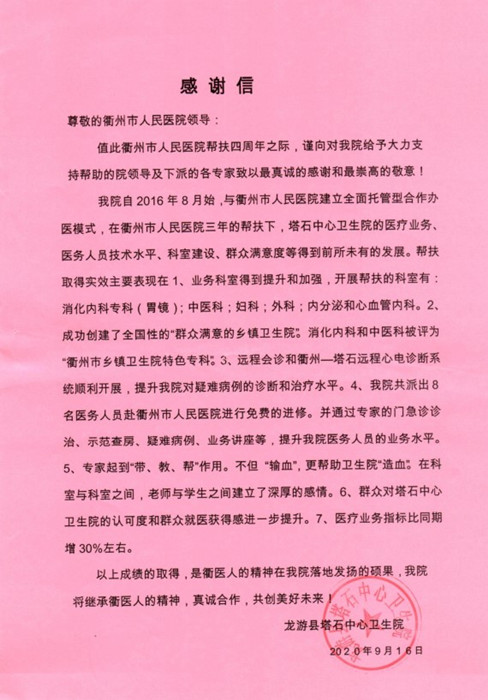 感謝信(致衢州市人民醫(yī)院) 文章來源: 作者: 點擊數(shù):5823 更新時間:2020-09-16 上一篇: 感謝信(致衢州市人民醫(yī)院) 下一篇: 感謝信(致張承亮、江菲菲醫(yī)師)