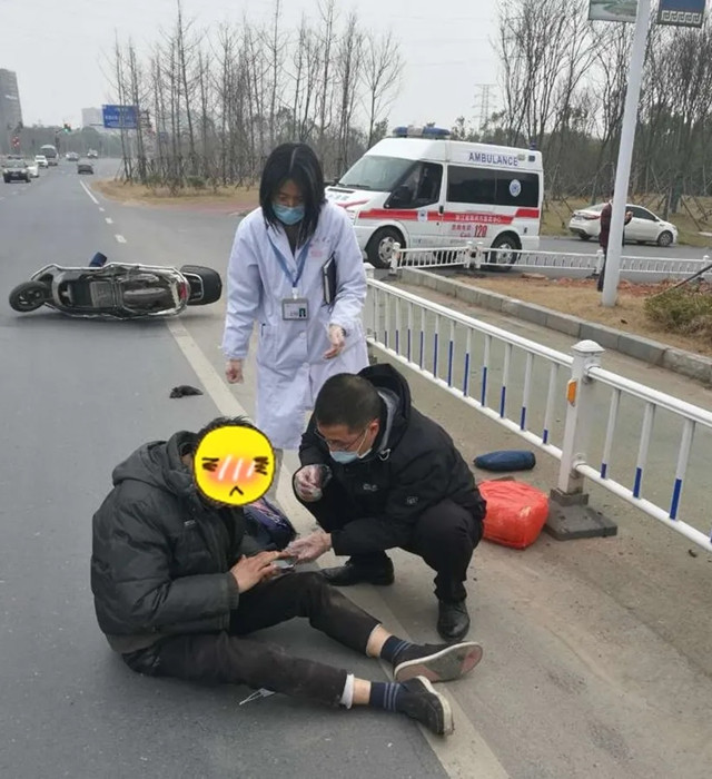 “大伯,沒事的,我是醫(yī)生,可以幫你做一些簡單處理?!?/span> 林瑜一邊用手按壓住疑似骨折的部位,保持固定防止二次損傷,一邊陪伴在傷者身邊耐心安撫,等待救護(hù)車的來臨。