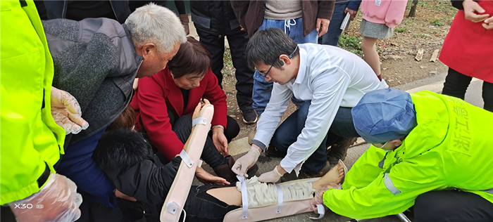躺在地上的女士小腿上有傷口,腿根本無法動(dòng)彈,嚴(yán)欣江判斷可能是骨折,于是,他馬上從車子的后備箱里拿出紗布袋,現(xiàn)場制作竹片夾板應(yīng)急,固定患側(cè)肢體,小心包扎,緊急處置完成后,安慰女士耐心等待救援。