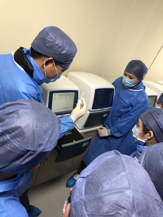 在核酸檢測實驗室內(nèi),祝進主任對每一個檢驗人需要熟知的理論知識和實踐操作進行了細致的講解,培訓(xùn)人員全神貫注地聆聽,檢測設(shè)備如何規(guī)范操作?操作要點有哪些?有哪些注意事項……檢驗科待培人員輪流進行實操,反復(fù)進行練習(xí)。