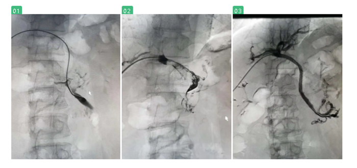 經(jīng)過季肋部穿刺至門靜脈時(shí),發(fā)現(xiàn)江先生的門靜脈及腸系膜上靜脈已完全閉塞,程國兵巧妙地引入導(dǎo)絲、放入導(dǎo)管,一點(diǎn)點(diǎn)清除門靜脈血栓,最后,成功放入支架。