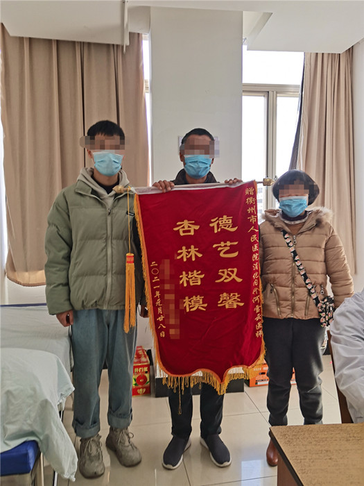 近日,安先生攜家人一起來到我院消化內(nèi)科門診,將一面寫有“德藝雙馨、杏林楷模”的錦旗交到消化內(nèi)科主任醫(yī)師何雪云手中,連聲稱贊何雪云醫(yī)德高尚。