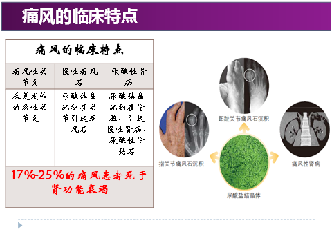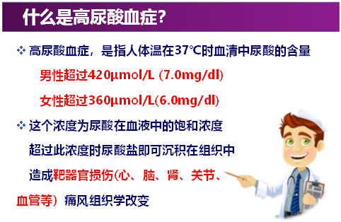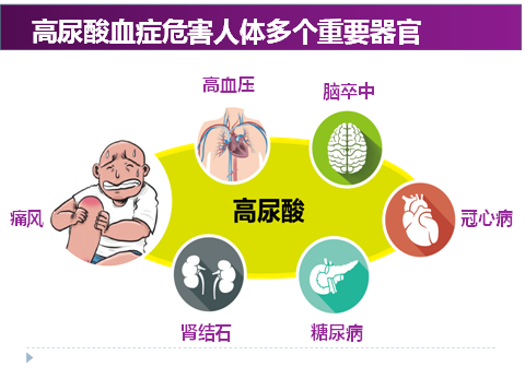 高尿酸血癥發(fā)病率逐年上升,目前已經(jīng)成為繼高血壓、高血糖、高血脂后的第四高。大量研究表明,高尿酸血癥是糖尿病、高血壓、慢性腎病、冠心病、腦卒中等疾病的危險(xiǎn)因素。而痛風(fēng)只是冰山一角,痛風(fēng)以外的無癥狀高尿酸血癥危害是潛在的、持續(xù)性,長期危害性更大,須引起人們的足夠重視。鑒于高尿酸血癥的嚴(yán)重危,害性,國內(nèi)外共識(shí)和指南建議血尿酸>420umol/L起始藥物干預(yù)治療使血尿酸長期控制在360umol/L以下,減少高尿酸血癥帶來的嚴(yán)重并發(fā)癥。
