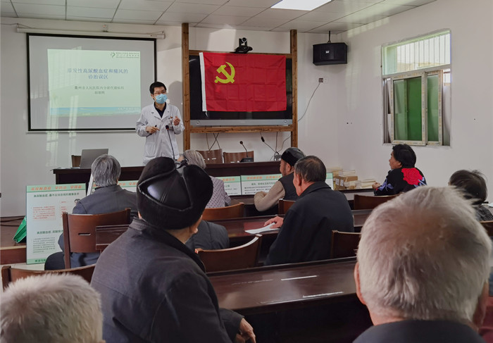 活動(dòng)現(xiàn)場,內(nèi)分泌代謝病科主任醫(yī)師胡朝暉、副主任醫(yī)師萬金星提供痛風(fēng)咨詢服務(wù),護(hù)士們免費(fèi)為村民監(jiān)測尿酸、測量血壓和血糖,發(fā)放健康宣教資料等。專家們還針對高尿酸保健常識(shí)、疾病癥狀、用藥注意事項(xiàng)、飲食指導(dǎo)等方面開展健康講座,在場的痛風(fēng)患友受益匪淺。