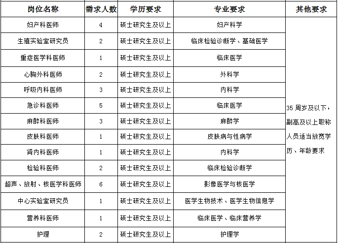 本次,溫州醫(yī)科大學(xué)附屬衢州醫(yī)院(衢州市人民醫(yī)院)計劃引進48名醫(yī)療衛(wèi)生專業(yè)技術(shù)人才,引進工作由市衛(wèi)健委會同我院組織實施,具體招聘情況如下: