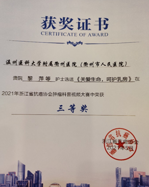 近日,在浙江省抗癌協(xié)會(huì)腫瘤護(hù)理專委會(huì)舉辦的2021年浙江省腫瘤科普視頻大賽中,我院乳甲外科作品《關(guān)愛生命,呵護(hù)乳房》榮獲三等獎(jiǎng)!