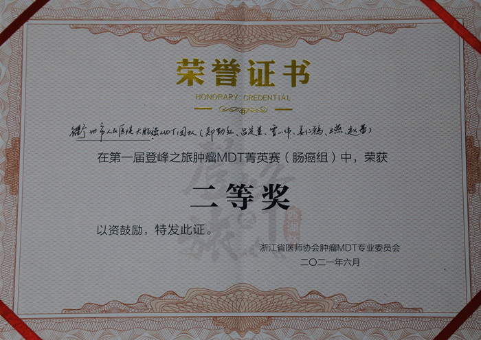 6月4日上午,由浙江省醫(yī)師協(xié)會(huì)腫瘤MDT專業(yè)委員會(huì)主辦的第一屆登峰之旅腫瘤MDT菁英賽(腸癌組)在杭州蕭山舉行。經(jīng)過激烈的角逐,我院腫瘤內(nèi)科主任鄭勤紅帶領(lǐng)的大腸癌MDT團(tuán)隊(duì),一舉斬獲二等獎(jiǎng)和最佳人氣獎(jiǎng)兩項(xiàng)榮譽(yù)。