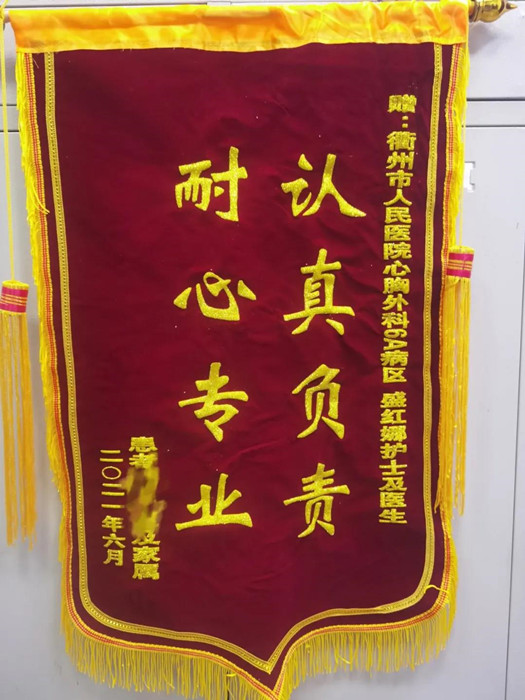 盛紅娜護士評估充分、判斷迅速、處置得當,規(guī)避了可能出現(xiàn)的嚴重后果。徐先生家屬特地定制錦旗,表達對心胸外科醫(yī)護人員的感激。