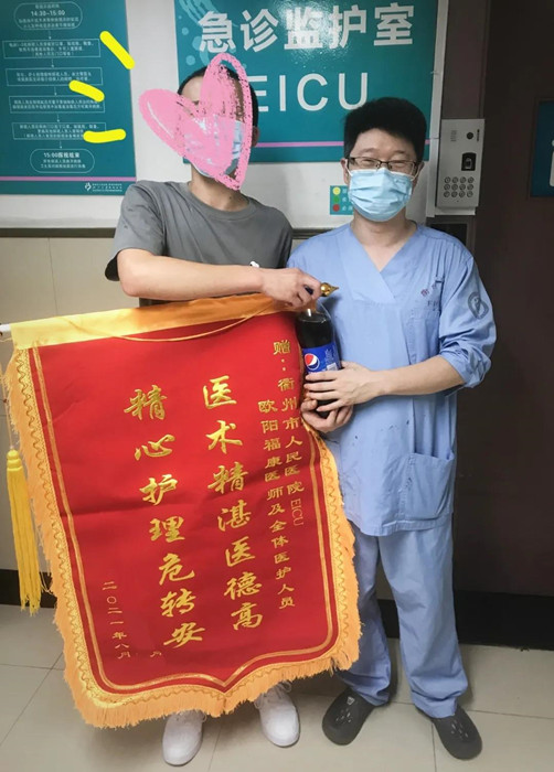 至今,“可樂”男孩已經(jīng)出院半個(gè)月了,在醫(yī)師節(jié)這個(gè)特殊的日子里,他給這個(gè)曾經(jīng)幫助過他的醫(yī)護(hù)送來了節(jié)日禮物——錦旗。EICU可愛的醫(yī)護(hù)也回贈(zèng)了這個(gè)可愛的大男孩一瓶可樂,兌現(xiàn)了之前許下出院就能喝可樂的承諾,希望他以后的生活“德行可象,聲氣可樂”。