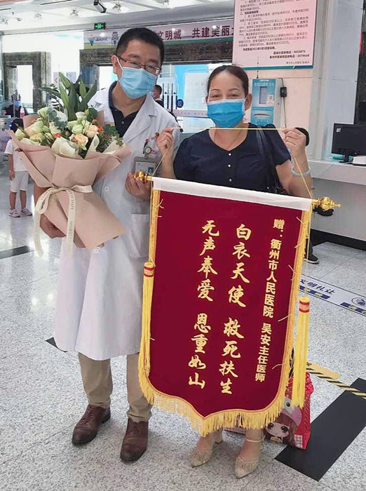 “我很想看看吳安醫(yī)生的臉,可惜他戴著口罩,在我印象中,他很帥!” 9月1日,來自柯城區(qū)的姚女士手捧鮮花和禮物,將一面寫著“白衣天使 救死扶傷 無聲奉愛 恩重如山”字樣的錦旗送到我院神經(jīng)外科主任醫(yī)師吳安手中。