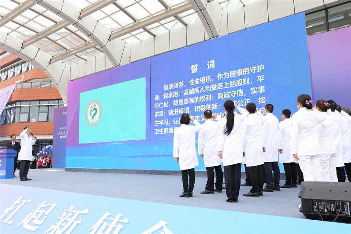 四省邊際中心醫(yī)院(衢州市人民醫(yī)院)黨委書記陳成水和醫(yī)護代表現(xiàn)場宣誓?!敖】邓?,性命相托……”宣誓詞的錚錚誓言體現(xiàn)了醫(yī)院全體干部職工“以人為本、呵護健康”的初心和使命。