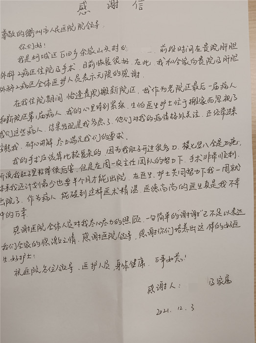 “能碰到這樣醫(yī)術精湛、醫(yī)德高尚的醫(yī)生是我的幸運,一句感謝不足以表達我的感激之情!”日前,來自萬田鄉(xiāng)的方阿姨給我院肝膽外科2送來一封手寫的感謝信,對周一農主任及其帶領的肝膽外科2團隊表示由衷的感謝。