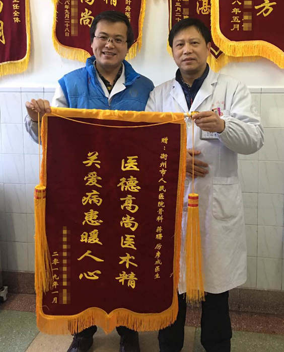 2月9日,家住柯城雙水橋的郭阿姨帶著一面寫有“醫(yī)德高尚醫(yī)術(shù)高,關(guān)愛病患暖人心”的錦旗來到了我院七病區(qū)骨科,將錦旗親手送給了蔣曙主任醫(yī)師和歷彥成醫(yī)師,向他們表達深深的謝意。
