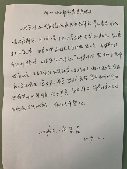 這一切都被一旁的方阿姨家人看在眼里,記在心里,不知道用什么方式去表達內(nèi)心的感激,于是親筆書寫了一封最樸實的表揚信送給血液內(nèi)科全體醫(yī)護人員。