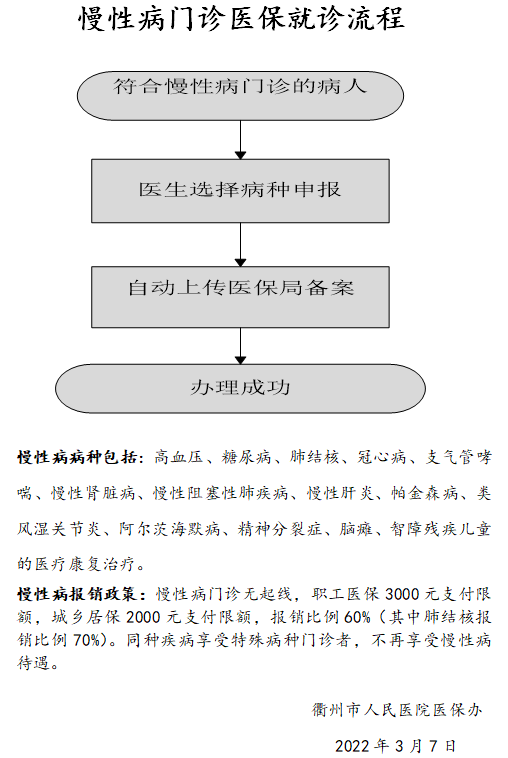 醫(yī)保慢性病/特殊門(mén)診辦理流程 文章來(lái)源:醫(yī)保辦 作者: 點(diǎn)擊數(shù):6869 更新時(shí)間:2022-03-08 上一篇: 醫(yī)保相關(guān)查詢(xún)地點(diǎn)和導(dǎo)引 下一篇: 醫(yī)保報(bào)銷(xiāo)比例
