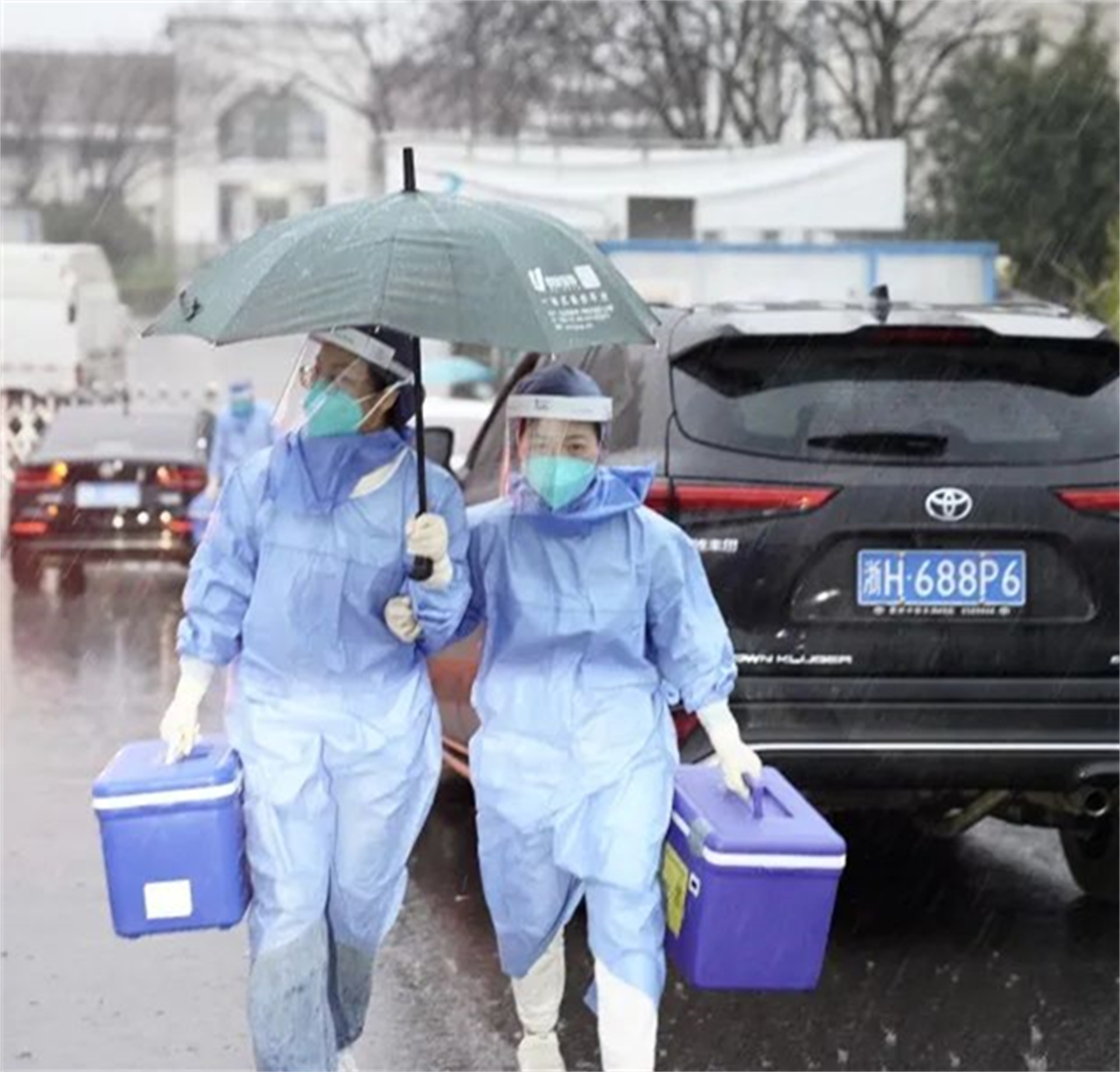 一箱又一箱的核酸采樣標(biāo)本不斷地運(yùn)到基地。傍晚,一場(chǎng)滂沱大雨猝不及防,原本緊張忙碌的標(biāo)本運(yùn)送工作變的更加艱難,然而,和病毒爭(zhēng)速度,搶時(shí)間不能停。