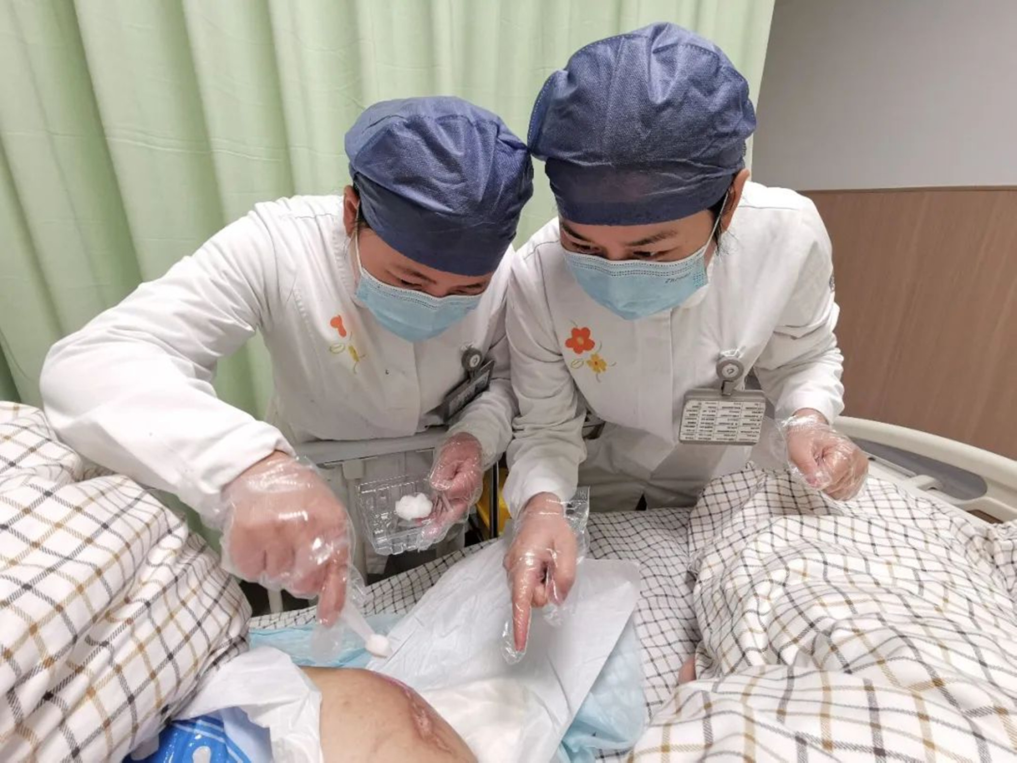 “先把創(chuàng)面用雙氧水進(jìn)行消毒,再噴灑生長因子……”創(chuàng)面修復(fù)科主任杜勝虎正將出院的鄭老伯送上轉(zhuǎn)運(yùn)車,并仔細(xì)地叮囑注意事項(xiàng)。