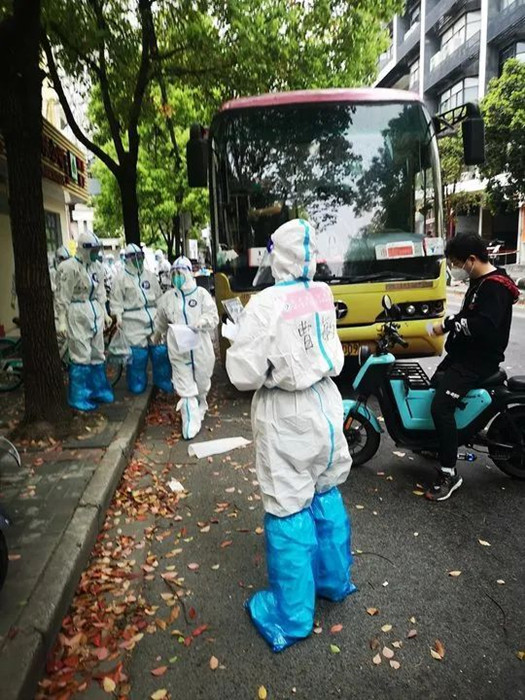 從嘉興駛往上海的近兩個小時里,曹老師就沒停歇過:與上海社區(qū)工作人員電話對接工作,根據(jù)社區(qū)居民人數(shù)進行人員分配,與其他車隊領(lǐng)隊對接任務(wù)布置,解答下級反饋上來的問題,與上級領(lǐng)導(dǎo)對接指令……到達目的地,曹老師又千叮嚀萬囑咐大家要注意防護,規(guī)范操作,遇到問題如何處置。采樣過程中,曹老師又穿著防護服跑到每個點位上突擊檢查隊員們的防護和操作的規(guī)范性。完成任務(wù)后,大家各自回到大巴前,曹老師已經(jīng)布置好了一區(qū)二區(qū)防護脫卸的前期工作。兩人一脫,互相監(jiān)督。盡管這樣,大家還是小錯誤頻出,或亂了步驟,或一區(qū)二區(qū)不分等。曹老師親自監(jiān)督一百來號隊員的院感防護和脫卸過程,有時還要回頭看一下脫卸完畢準備上車時消殺是否規(guī)范。終于完畢,我發(fā)現(xiàn)曹老師的喉嚨已經(jīng)啞了?;爻痰能嚿?,曹老師打起了盹,但她并沒有沉沉睡去,而是隔幾分鐘睜開眼看下手機,看看是否有新的任務(wù)下達。總是早出晚歸,長時間的控水控大小便等,讓大家疲憊不堪,而當我們毫無憂慮地睡去時,曹老師又得為下一次任務(wù)操勞。