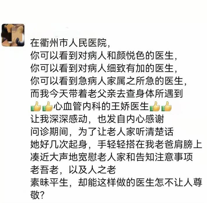 在第一次就診時,王嬌就發(fā)現(xiàn)黃老伯有些郁郁寡歡,詢問了黃老伯的兒子后才知道,黃老伯聽力衰退,經(jīng)常聽不清別人說什么,總以為自己得了重病。了解情況后的王嬌,便在之后的問診中多次起身湊近老伯,耐心詢問哪里不舒服,告訴老伯身體沒有大礙,老伯沒聽清時,王嬌就再重復一次,不厭其煩。